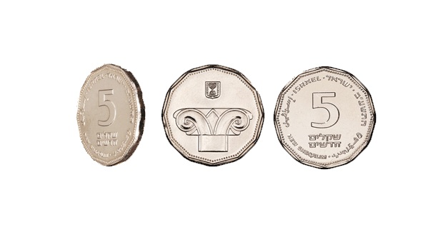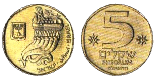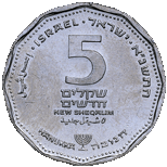 | 5 шекелей | 24 | 6 | Аверс: двойной рог изобилия; Герб Израиля; текст «Израиль» на иврите, арабском и английском языках. Реверс: цифра «5»; текст «шекелей» и дата выпуска на иврите; две стилизованных восьмиконечных звезды. |