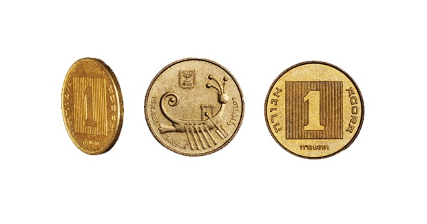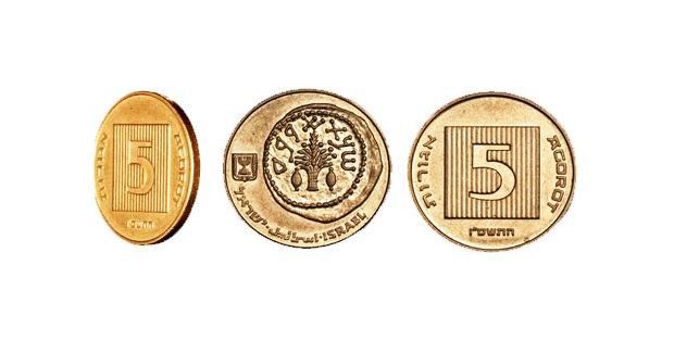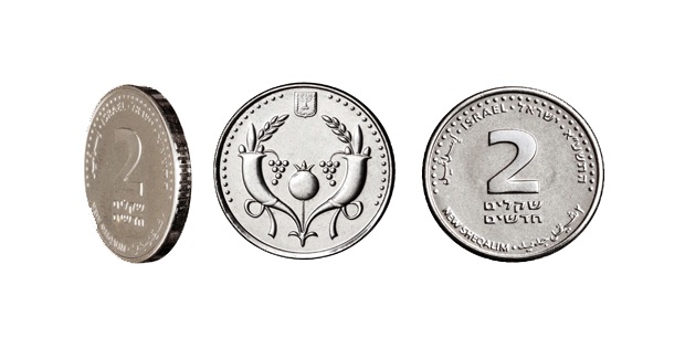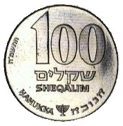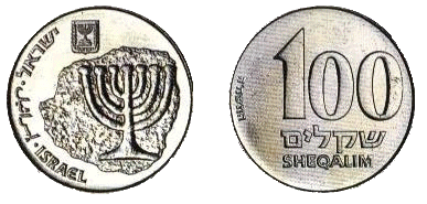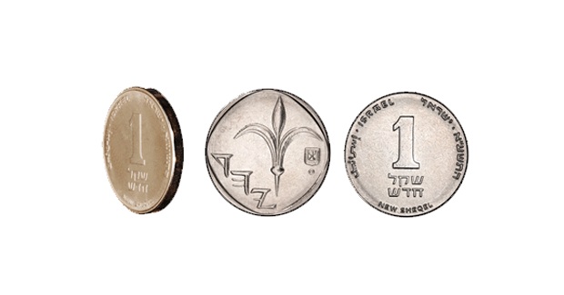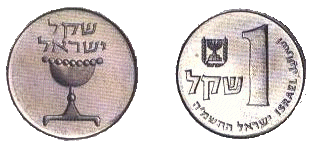| 1 шекель | 23 | 5 | Аверс: чаша и текст «израильский шекель» на иврите Реверс: Герб Израиля; цифра «1»; текст «шекель» на иврите; текст «Израиль» на иврите, арабском и английском языках; дата выпуска на иврите. |