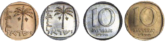 | 10 агор | 21,5 | 5 | Аверс: финиковая пальма; текст «Израиль» на иврите и арабском языке; Реверс: цифра «10»; текст «агор» и год выпуска на иврите. |