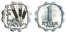 | 1 агора | 21 | 1,3 | Аверс: три ячменных колоса; текст «Израиль» на иврите и арабском языке. Реверс: цифра «1»; текст «агора» и год выпуска на иврите; |