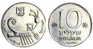 | 10 шекелей | 26 | 8 | Аверс: древняя галера; герб Израиля; текст «Израиль» на иврите, арабском и английском языках. Реверс: цифра «10»; текст «шекелей» и год выпуска на иврите; две стилизованных восьмиконечных звезды. |