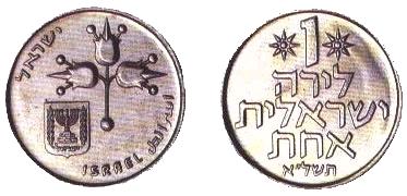 | 1 фунт | 27,5 | 9 | Аверс: Герб Израиля; 3 плода гранатового дерева; текст «Израиль» на иврите, арабском и английском языках; Реверс: цифра «1»; текст «один израильский фунт» и год выпуска на иврите; две декоративные восьмиконечные звезды. |