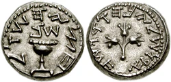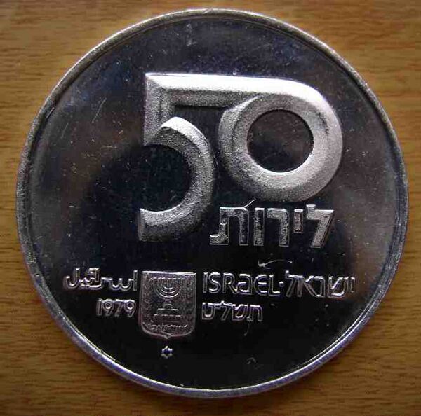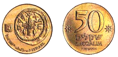 | 50 шекелей | 28 | 9 | Аверс: изображение монеты времён еврейских войн против римлян; герб Израиля; текст «Израиль» на иврите, арабском и английском языках; Реверс: цифра «50»; текст «шекелей» и год выпуска на иврите; две стилизованных восьмиконечных звезды. |