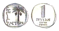 | 1 новая агора | 15 | 0,6 | Аверс: финиковая пальма; текст «Израиль» на иврите и арабском языке; Реверс: цифра «1»; текст «новая агора» и год выпуска на иврите. |