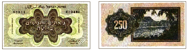 | 250 прут | 100 × 55 | Зеленовато-коричневый | Аверс: Виньетка для защиты от подделки; текст «Государство Израиль» на иврите и арабском языке, «Двести пятьдесят прут» и «Законное платёжное средство» на иврите, цифра «250» в четырёх углах. Реверс: Виньетка; цифра «250», изображение озера Кинерет в узорной рамке. |