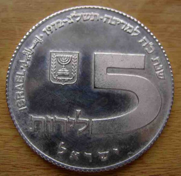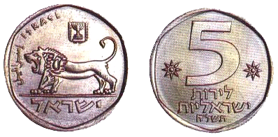 | 5 фунтов | 30 | 11,2 | Аверс: рычащий лев; герб Израиля; текст «Израиль» на иврите, арабском и английском языках; Реверс: цифра «5»; текст «израильских фунтов» и год выпуска на иврите; две декоративные восьмиконечные звезды. |