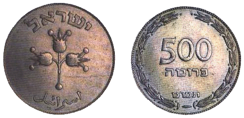 | 500 прут | 37,1 | 25 | Аверс: 3 плода гранатового дерева; текст «Израиль» на иврите и арабском языке; Реверс: цифра «500»; текст «прута» и год выпуска на иврите; две стилизованных ветви оливы по кругу. |