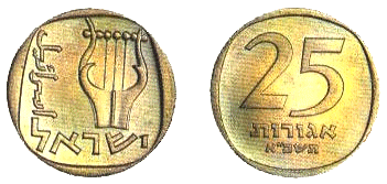 | 25 агор | 25,5 | 6,5 | Аверс: музыкальный инструмент лира с тремя струнами; текст «Израиль» на иврите и арабском языке; Реверс: цифра «25»; текст «агорот» и год выпуска на иврите. |