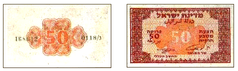 Аверс: Виньетка для защиты от подделки; текст «Государство Израиль» на иврите и арабском языке, «Законное платёжное средство» на иврите, цифра «50». Реверс: Виньетка; цифра «50». |