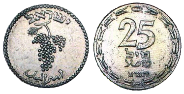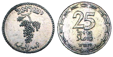 | 25 милей | 30 | 3,1—3,8 | Аверс: гроздь винограда; текст «Израиль» на иврите и арабском языке; Реверс: цифра «25»; текст «Миль» на иврите и арабском языке; две стилизованных ветви оливы по кругу. |