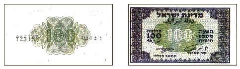 | 100 прут | 70 × 42 | Зеленовато-голубой | Аверс: Виньетка для защиты от подделки; текст «Государство Израиль» на иврите и арабском языке, «Законное платёжное средство» на иврите, цифра «100». Реверс: Виньетка; цифра «100». |