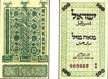 | 100 милей | 80 × 48 | Зелёный | Аверс: Мозаичный пол древней синагоги в районе кибуца Бейт Альфа; текст «Израиль» и «100 милей» на иврите и арабском языке, цифра 100 в четырёх углах. Реверс: Мозаичный пол древней синагоги в Бейт Альфа; цифра «100». |