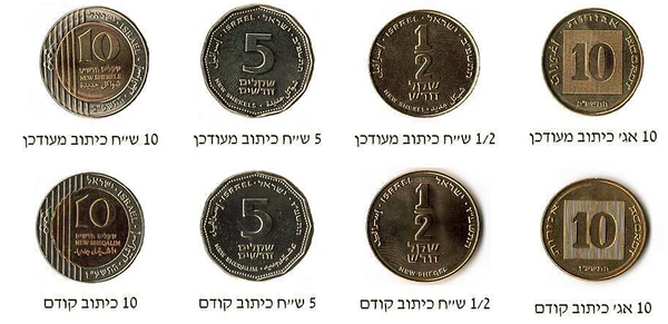 Годы выпуска на монетах Израиля указаны в соответствии с традиционным еврейским календарём, в котором вместо цифр используются символы еврейского алфавита — каждой букве соответствует своё числовое значение.