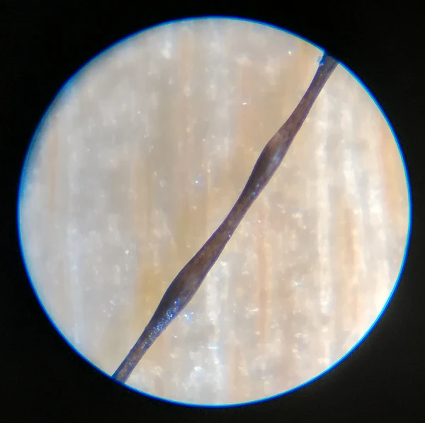 - При микроскопическом исследовании волоса выявляются чередующиеся конусовидные участки нормальной толщины и зоны сужения волосяного стержня. Пигментация сохраняется как в «расширенных», так и в суженных фрагментах волоса[3]. Волосы в виде «бусин на нитке»[10]. При сканирующей электронной микроскопии дополнительно выявляются разрывы волосяного стержня[4].