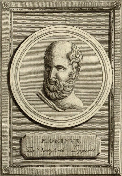 Моним Сиракузский, по сведениям, был рабом одного коринфского менялы. Ксениад, который купил Диогена, часто бывал у его хозяина, и своими рассказами «о его добродетели, о его словах и делах возбудил в Мониме любовь к Диогену». Моним притворился сумасшедшим, стал перемешивать на меняльном столе мелочь с серебром, пока наконец хозяин не отпустил его на волю. Моним сразу явился к Диогену и стал жить как он и Кратет, его ученик (а хозяин, как говорят, глядя на это, все больше убеждался в его безумии).