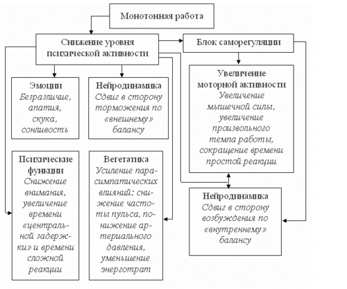 Если рассматривать монотонию с психологической точки зрения, то её суть состоит в ослабевании внутренних побудителей деятельности человека (мотивов, интересов, целевой направленности и т. д.), в физиологическом плане при монотонии снижается функциональная активность и работоспособность человека.[11]