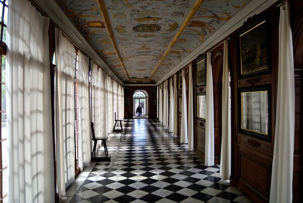 «Променад» (терраса) морского фасада вымощен красным клинкерным (особо прочным) кирпичом. Полы галерей (22 м длиной каждая) выложены, по-голландски, в шахматную клетку плитами белого и чёрного мрамора. В галереях находятся 23 картины в чёрных лаковых рамах. Это часть коллекции, собранной царём Петром в заграничных путешествиях. Среди них — картины любимого царём амстердамского живописца-мариниста Адама Сило, по которым, согласно легенде, сам Пётр принимал экзамен у учеников Морской академии на предмет знания оснастки кораблей[5]. Росписи плафонов (потолков) галерей Монплезира выполнены мастерами московской Оружейной палаты по рисункам французского живописца-декоратора Филиппа Пильмана.