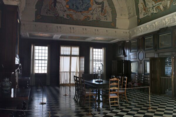Стены главного, парадного зала Монплезира обшиты дубовыми панелями, в которые вмонтированы картины в чёрных рамах. Пол выложен мраморными плитами по-голландски, «в шахмат». Этот зал воспроизведён на знаменитой картине Н. Н. Ге «Пётр I допрашивает царевича Алексея Петровича в Петергофе» (1872). Стены зала завершены высокими падугами и расписным плафоном с изображениями бога Аполлона, персонажей итальянского театра Комедия дель арте и головами «четырёх ветров»: Зефира, Нота, Борея, Эвра. Росписи в 1718 году создал Пильман вместе с русскими подмастерьями. Скульптурные гермы из алебастра (аллегории времён года) в углах падуг выполнены, по одной версии, Б. К. Растрелли Старшим, по другой — Жаном-Батистом Александром Леблоном и Николя Пино[6].