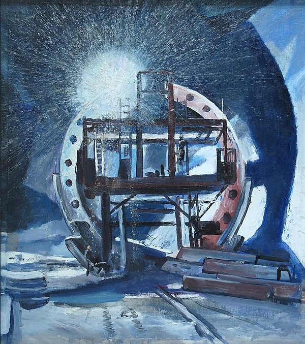 На полотне представлена индустриальный пейзаж, в центре которого располагается разрезанная цилиндрическая конструкция с круглыми отверстиями на срезе. Перед ней находятся трёхъярусные металлические леса с лестницами, на которых изображены фигуры монтажников: двое слева и один справа на втором ярусе. Слева и справа на переднем плане, на фоне заснеженной земли, размещены различные металлические конструкции. В верхней левой части цилиндра отмечено свечение прожектора с характерными отблесками. Работа выполнена в преимущественно синих, белых и чёрных оттенках, что подчёркивает холодную цветовую гамму композиции.