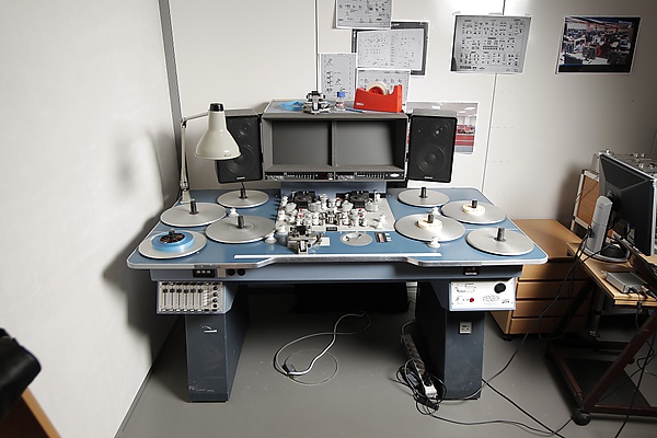 С появлением видеомагнитофонов технология не изменилась. Сказывалась громоздкость аппаратуры и сложности с синхронизацией положения магнитофильмов. Дело осложнялось тем, что поперечно-строчная видеозапись должна быть разрезана без нарушения её отдельных строк, и склеена так, чтобы не вызвать сбоев синхронизации видеосигнала. Для этого магнитные дорожки проявлялись специальным порошком, а склейка происходила по шаблону под микроскопом[12].