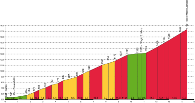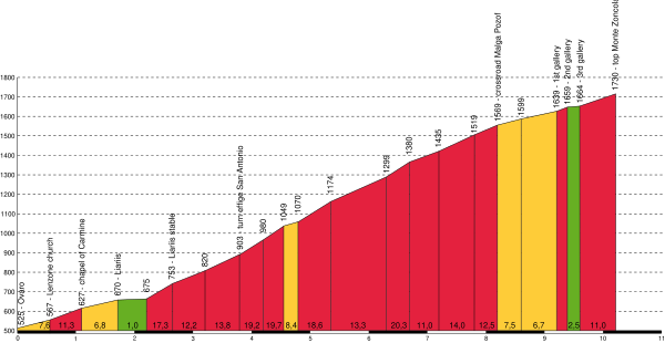 - С запада из Оваро: Это очень сложный подъём, один из самых сложных в Европе, обычно сравниваемый с Альто дель Англиру в северной Испании.[1] Впервые он преодолевался на Джиро д’Италия в 2007 году. Восхождение начинается в Оваро, в долине Горто и представляет собой подъём длиной 10,1 км, перепадом высот 1210 м, средним градиентом 11,9 % и максимальным — 22 %. На первых двух километрах градиент не столь значителен. Настоящий же подъём начинается после того, как дорога делает резкий изгиб вправо в деревне Лиара, за 8,5 км от вершины. Вскоре после деревни, дорога исчезает в лесу и следующие 6 км средний градиент составляет 15 %, а перепад высот — 900 м. Далее дорога проходит через три коротких тоннеля, где градиент существенно ниже (около 7 %), после чего следует 500-метровая секция крутых поворотов у вершины горы со средним градиентом 10,6 % и максимальным — 14 %. Старый грубый асфальт между Лиарой и туннелями был заменен в 2007 году, а между последним тоннелем и вершиной — осенью 2005 года. Сейчас тоннели освещены.[3][4][5]