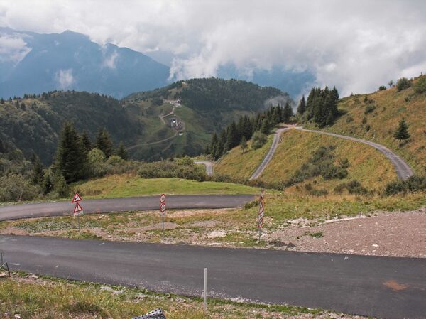 - С востока из Приолы: этот маршрут проходит по первоначальной, старой дорогой к вершине, которая была заменена новой дорогой из Сутрио, описанной выше. Обе дороги объединяются за 4 км ниже вершины. Дорога из Приолы была впервые заасфальтирована осенью 2005 года. Снизу до вершины подъём протяженностью 8,9 км и с перепадом высот 1140 м имеет средний градиент 12,8 %. Нижняя часть характеризуется острыми изгибами и местами очень крутая. После слияния с новой дорогой следуют относительно пологие 1,5 км, а далее оставшиеся 3,5 км, на которых присутствует несколько рамп с крутизной до 23 %.[7]