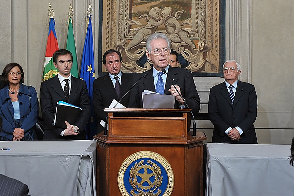 После отставки по собственному желанию премьер-министра Италии Берлускони 13 ноября 2011 года кандидатура Монти на пост председателя Совета министров Италии была поддержана Парламентом Италии. После сформирования технического правительства 16 ноября вступил в должность, её он собирался исполнять до парламентских выборов 2013 года[4], также Монти 18 ноября, получив вотум доверия Парламента, назначил себя на должность министра экономики и финансов[5].