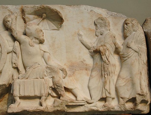 На этих фризах сам Арбинас изображен согласно персидской традиции.[12] Значительную часть места на фризах скульпторы выделили для фигур различных воинов, в том числе гоплитов и лучников.[13]