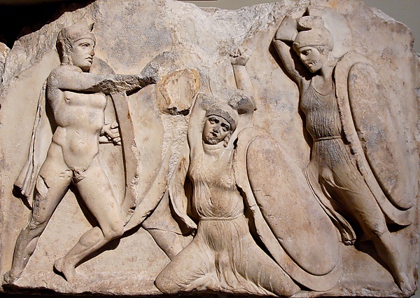Нижний фриз постамента был составлен из 22 мраморных блоков покрытых рельефными изображениями, из которых семь были потеряны или сохранились фрагментарно. Сохранены рельефы изображают героические батальные сцены, без четкого сюжета. На них изображены воины, одетые в греческие костюмы и доспехи. В отличие от многих фриз аналогичного периода, они не изображают сцены борьбы против амазонок, кентавров или других очевидно иноземных существ.[10]