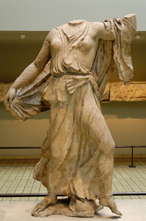 До сегодняшнего дня сохранилось одиннадцать скульптур, которые располагались между колоннами гробницы. Скульптуры идентифицированы как нереиды (морские нимфы)[18], поскольку у ног семи из них были изображены различные морские существа, в том числе дельфины, каракатицы, и птицы, возможно, чайки. Скульптуры довольно сильно повреждены, все они потеряли руки и головы. В то же время, несмотря на повреждения, поражает мастерство скульптур, легкость складок одежды и воздушность движений.[19]