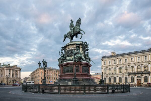 - Конный памятник Николаю I, созданный в 1856—1859 гг (Скульпторы П. К. Клодт, Р. К. Залеман, Н. А. Рамазанов). Проект Монферрана утвержден в мае 1856 г., через месяц определено место установки памятника: напротив Мариинского дворца, лицом к Исаакиевскому собору[33].