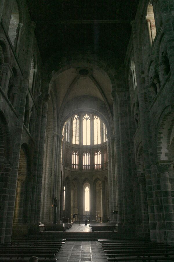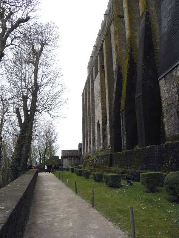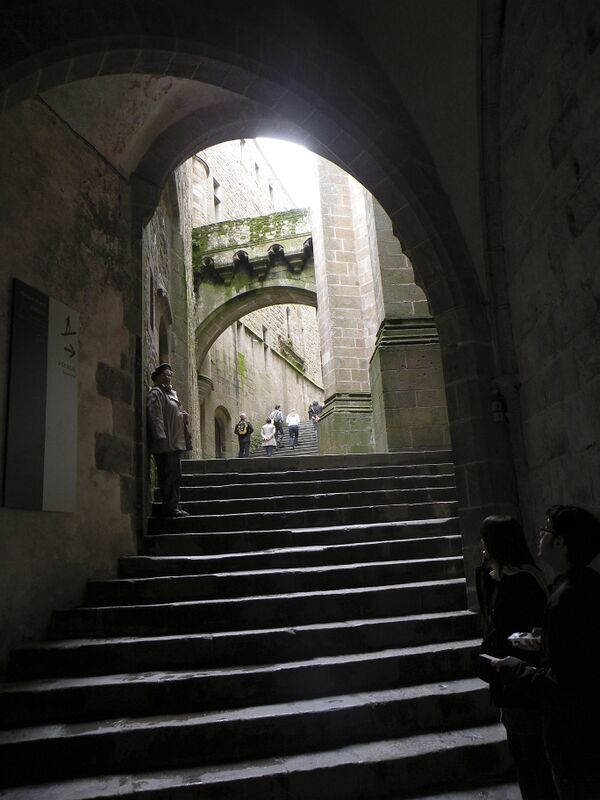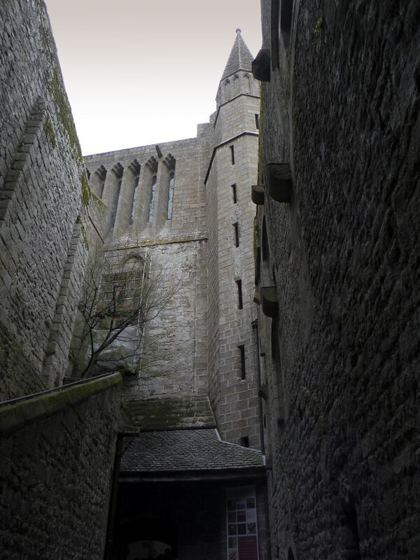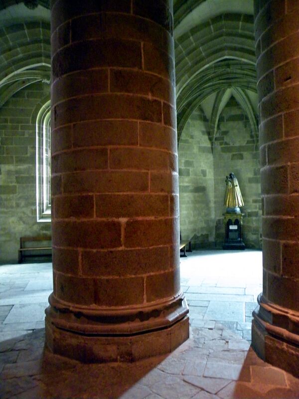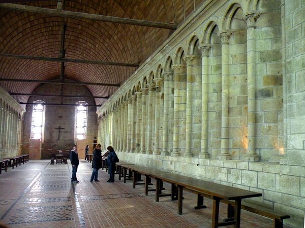 Ещё ниже — соответственно помещение для капелланов и подвальное помещение. Учитывая предыдущие катастрофы, северная стена здания была укреплена контрфорсами, что создало настолько сильный художественный эффект, что Виктор Гюго назвал вид на аббатство со стороны моря видом на «самую красивую стену Европы».