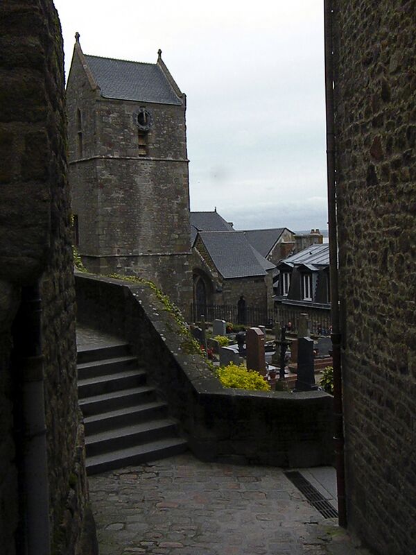 При церкви находится небольшое кладбище. В 1204 году бретонцы сожгли поселение и часть монастырских строений. Нынешнее поселение, находящееся на южном склоне, может быть датировано не ранее, чем первой половиной XIII века. Современный город расположился по обе стороны от единственной дороги, поднимающейся к аббатству по юго-восточному склону горы. Помимо участия в работе сферы обслуживания, постоянные жители города (около 30 человек) занимаются сельским хозяйством на освобождённых, благодаря проведённым в XIX веке мелиоративным работам, землях.