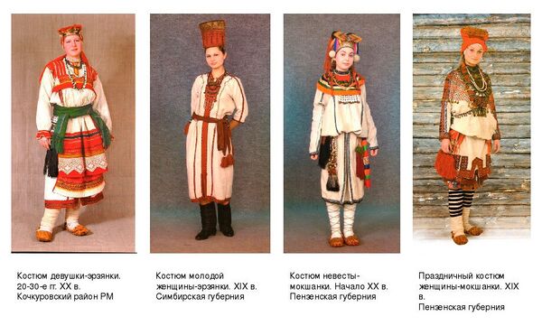 Отличительной чертой мокшанского костюма являлся пышный объём, который делался посредством напуска пазухи спереди. В эрзянском костюме ансамбль набедренных украшений был чрезвычайно самобытным. В 13–14 лет, а в ряде мест и раньше, эрзянские девочки начинали носить набедренник пулай (пулогай, пулакш, пулокаркс). В костюме это был своего рода символ зрелости, совершеннолетия. Для мокшанского женского костюма характерны туникообразная рубаха (панар, щам) без воротника длиной до колен с боковыми вставками, большой пазухой (пов)[3]. Эрзянский панар шили из двух полотнищ холста, перегнутых пополам и сшитых по продольной нитке. Рубахи мокшанок имели отличие в покрое и отделке. Перегнутая пополам по поперечной нити точь холста была основой стана рубахи, к которой по бокам пришивались полотнища покороче. Такой покрой образовывал у плеча квадратную пройму для рукавов. Особая роль в национальном женском костюме отводилась головным уборам, они строго соответствовали возрасту, семейному положению, были взаимосвязаны с традиционным типом костюма. Женские головные уборы эрзи (панго, сорока, сорка, гилыган) были высокими, делались на твёрдой основе и имели варианты форм в виде цилиндра, полуцилиндра, конуса, реже лопатообразную. Мокшанские головные уборы (панга, златной), род мягкого чепца трапециевидной формы, состояли из двух-трёх частей.