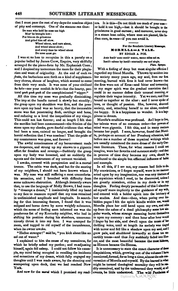 Этот рассказ для Эдгара По — повод поразмышлять о том, что происходит с личностью, идентичностью человека после его смерти. Самоидентичность Мореллы, переживая физическую, телесную смерть, воплощается в её дочери[3]. Эдгар По явно находился под впечатлением «философии тождества» Шеллинга, которого он упоминает в тексте новеллы[4].