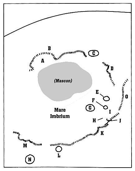 Обозначения соответствуют буквенным индексам на изображении справа. (A) Залив Радуги, (B) горы Юра, (C) Платон, (D) горы Альпы, (E) Аристилл, (F) Автолик, (G) Архимед, (H) Болото Гниения, (J) место посадки Аполлона-15, (K) горы Апеннины (L) Эратосфен, (M) горы Карпаты, (N) Коперник, (O) горы Кавказ.