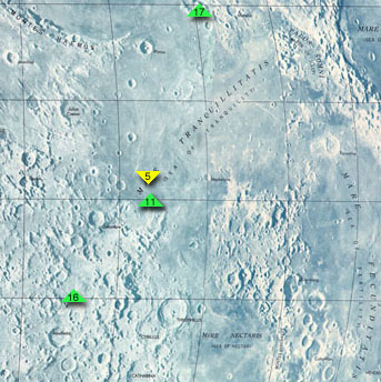 - 20 июля 1969 года около «Сервейера-5» (G) приземлился посадочный модуль «Аполлона-11», что стало первой высадкой людей на Луну. Место посадки было названо Базой Спокойствия. Астронавты доставили оттуда около 21 кг образцов[3].