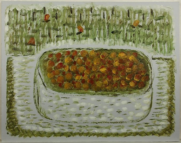 В центре композиции на светлом фоне изображена чаша прямоугольной формы с чётко обозначенным зелёным контуром, наполненная жёлто-красными ягодами морошки. Нижнюю часть картины по краям обрамляет полоса тёплого зелёного цвета, подчёркивающая предметы переднего плана. В верхней части полотна представлено условное изображение болота, выполненное зелёным цветом, что создаёт ассоциацию с природной средой. Работа отличается лаконичной композицией и сдержанной цветовой гаммой, характерными для натюрморта.
