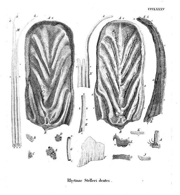 У морских коров (у стеллеровой коровы — точно) нос и подвижная верхняя губа составляли отдалённое подобие мясистого хобота, доставлявшего в рот пищу. У них практически полностью отсутствовали зубы. У эмбрионов Hydrodamalis cuestae закладывались альвеолы верхних коренных зубов, на этом их развитие завершалось. Вместо зубов у морских коров был очень своеобразный аппарат из двух ребристых роговых пластин, одна из которых располагалась на нёбе, а другая на нижней челюсти. Для черепа этих зверей характерен сильный пахиостоз.