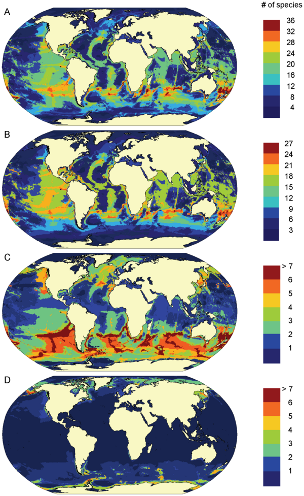 Другой возможный критерий различения морских млекопитающих — основные географические широты обитания: существуют тропические и субтропические виды, обитатели умеренных широт и жители Арктики и Антарктики. Некоторые виды строго привязаны только к одной из климатических зон — так, белый медведь, нарвал, белуха и гренландский кит обитают исключительно в арктических водах, а ареал сирен ограничен тропическими и субтропическими, — но другие свободно перемещаются между ними. Примером могут служить миграции некоторых усатых китов между холодными полярными и тёплыми тропическими водами или распространение косаток во всех климатических зонах[19]. Другие примеры космополитичных видов — серый дельфин и обыкновенный тюлень. В некоторых случаях близкородственные виды распространены в умеренных водах по обе стороны тропической зоны, без пересечений ареала. Таковы калифорнийская морская свинья, северный плавун и северный морской слон в Северном полушарии и близкие к ним аргентинская морская свинья, южный плавун и южный морской слон — в Южном. Такая специфика распространения, по-видимому, является результатом аллопатрического видообразования — возможно, в процессе плейстоценовых похолоданий, когда вид, изначально зародившийся по одну сторону экватора, распространялся во второе полушарие, а затем популяции разделялись при новом глобальном потеплении[21].
