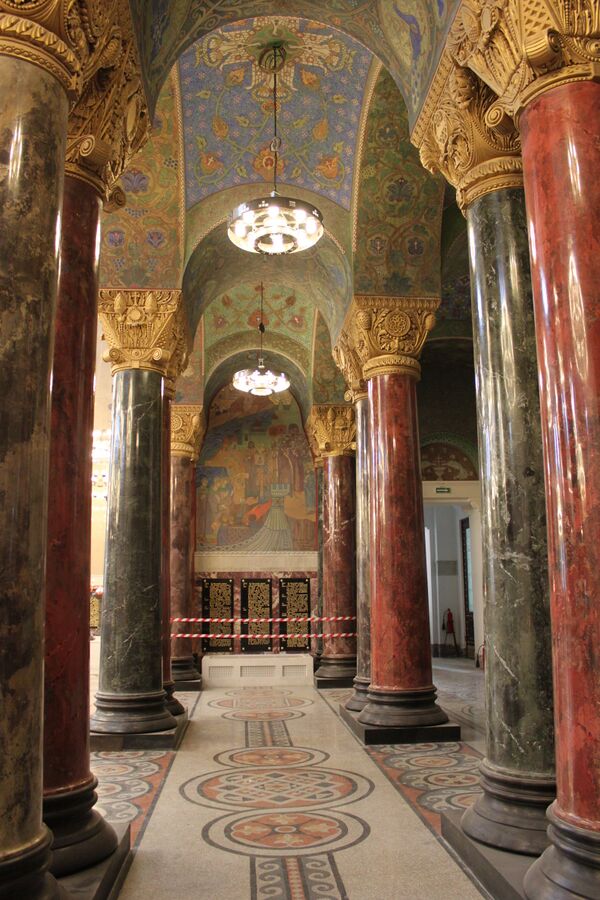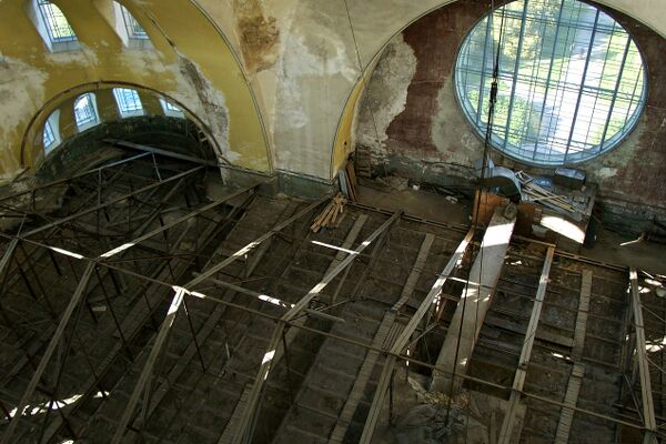 Сохранялся византийский орнамент на сводах, колоннада искусственного мрамора, ажурные капители. На месте иконостаса — театральная была устроена сцена. Узкая лестница вела в подкупольное пространство — по ней никто не ходил, наверху царило запустение. Сквозь выбитые окна веял ветер и лились дожди, а виднеющиеся на куполе звёзды можно было спутать с настоящими. На многие десятилетия здесь обосновались голуби. Лишь на потрескавшейся стене был виден побледневший от непогоды лик херувима…[5]