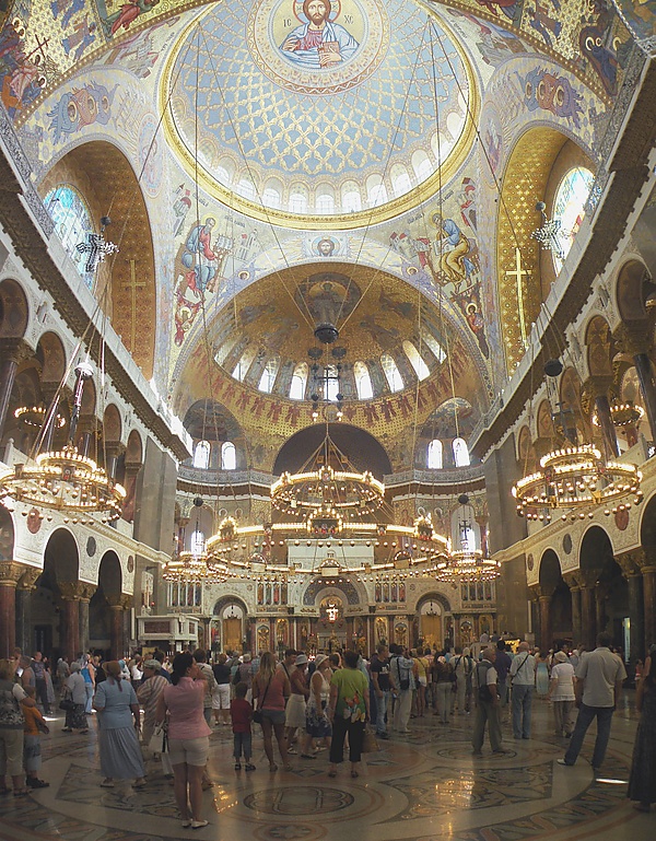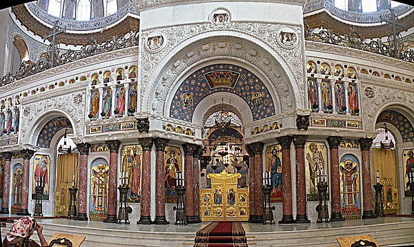 Алтарная часть приподнята в высоту на 4 метра. Иконостас работы скульптора Н. А. Попова по проекту В. А. и Г. А. Косяковых был исполнен из белого мрамора с мозаичными вставками. Над главным престолом возвышалась мраморная сень. Боковые приделы святых Петра и Павла и преподобного Иоанна Рыльского не были отделены от главного. В левой части солеи находилась мраморная кафедра для проповедей. Она была декорирована колонками и мраморными панелями, а также изображением Святого Духа в виде голубя. Иконостас был уничтожен в 1929 году и был полностью воссоздан по эскизам, архивным фотографиям и материалам[19].