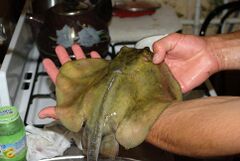 На вентральной поверхности диска расположены 5 жаберных щелей, рот и ноздри; за глазами жаберная полость открывается очень широкими брызгальцами, которые намного больше глаз и расположены близко друг к другу[10]. Во рту имеется 28—38 верхних и 28—43 нижних зубных ряда. Зубы мелкие и притуплённые. Дно ротовой полости покрывают бугорки[12].