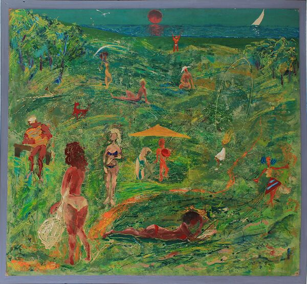 На полотне морского пейзажа представлено совершенно спокойное море при полуденном свете. Низко расположенная линия горизонта подчёркивает доминирующую роль плотного неба, занимавшего большую часть композиции. Справа тонкий поток света отражается в зеркальной глади воды, создавая световой акцент. Передний план занимает берег, покрытый ровным слоем песка.