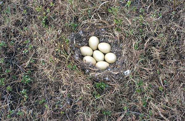 Гнездо — довольно глубокое углубление в земле — иногда полностью открыто, иногда слегка замаскировано у подножия большого камня, в зарослях кустарниковой берёзы либо в невысокой траве. В любом случае, даже на открытом гнезде плотно сидящую самку нелегко обнаружить, настолько близко она прижимается к земле и сливается с окружающим ландшафтом. Обычно гнездо расположено возле воды, однако почти всегда на сухом месте. В выкопанную ямку самка иногда добавляет несколько травинок и в конце всегда обильно выстилает пухом, выщипанным из груди. Сроки откладывания яиц варьируют в широких пределах и напрямую зависят от начала таяния снегов — например, в Исландии первые кладки отмечаются в третье декаде мая, на Шпицбергене и в Мурманской области в середине июня, а на северо-западе Гренландии или Новой Земле только в начале июля.[5][9] В гнезде обычно 5—8 яиц зеленовато-оливкового, зеленовато-бурого либо оливково-серого цвета, иногда с небольшим голубым или жёлтым оттенком. Размеры яиц (48—60) х (33—41) мм.[7] Сидит одна самка в течение 24 — 29 дней, в первое время периодически покидая кладку на кормёжку, а в конце очень плотно. Самец несколько дней находится в непосредственной близости от гнезда, однако в середине насиживания навсегда покидает гнездо и отлетает на морские побережья, где на период линьки сбивается в большие однополые стаи.[6]