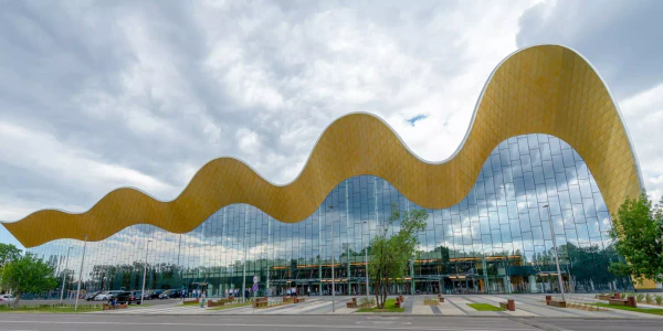 Архитектурная концепция здания («Мосинжпроект» был генеральным проектировщиком и техническим заказчиком) отталкивалась от идеи кровли в виде взмаха гимнастической ленты. Для создания кровли использовано специально изготовленное под её сложную геометрию алюминиевое покрытие площадью 15,2 тыс. м². Ещё одна особенность здания — 26-метровый фасад с витражным остеклением.