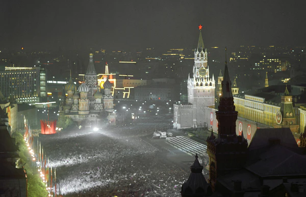 Над стенами возвышаются Большой Кремлёвский дворец, купола Архангельского собора и колокольня Ивана Великого.