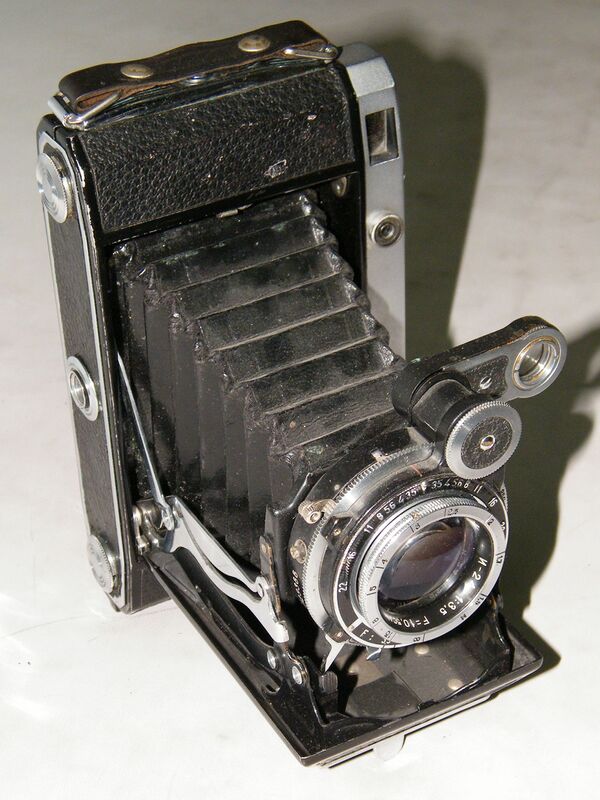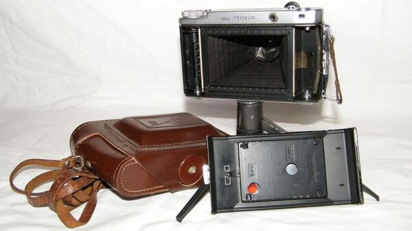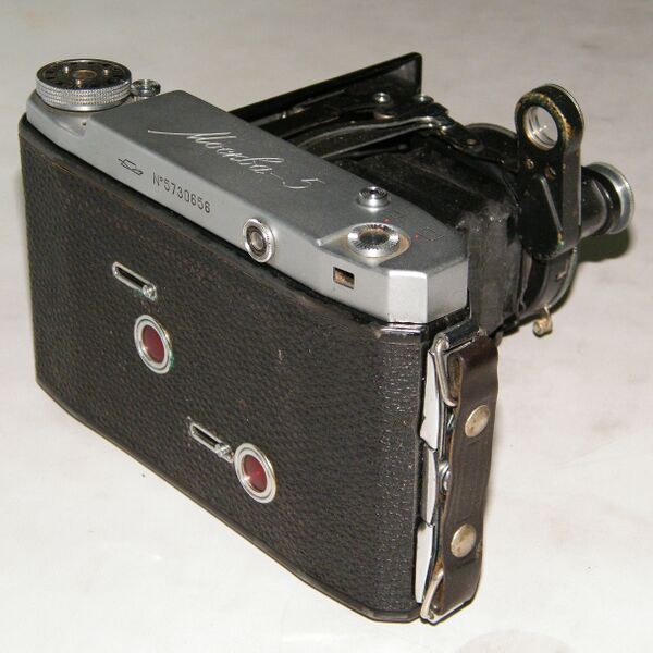 - Корпус складной, после откидывания передней панели автоматически с помощью системы рычагов выдвигался мех с оправой объектива и центральным затвором.