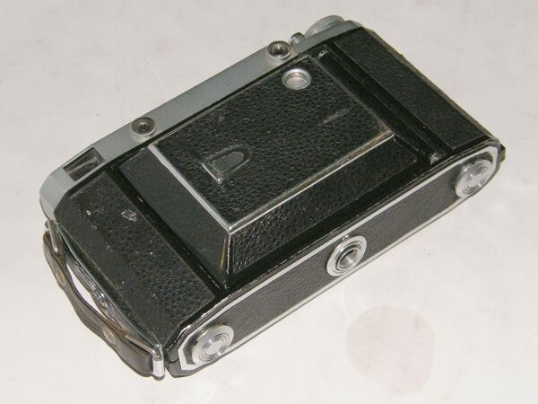 - Взвод затвора и перемотка плёнки раздельные. Перемотка плёнки по цифрам на ракорде рольфильма. На задней стенке камеры имеется два закрывающихся окна с красными светофильтрами. Размещённый на внутренней поверхности задней крышки переключатель позволял выбрать размер кадра 6×6 см или 6×9 см только при перезарядке фотоаппарата.