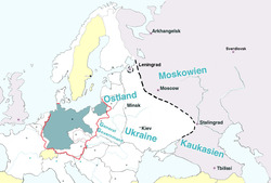 В планах нацистского руководства было создание Рейхскомиссариата Московия. Гитлер неоднократно говорил о том, что такие слова, как «русский» и «Россия» следует запретить, заменив на «московский» и «Московия»[31]. Нацистский остфоршунг разрабатывал целый комплекс мероприятий для того, чтобы искоренить упоминание о России и русских из лексикона немецких экспертов и пропагандистов. Один из специалистов по «русскому вопросу», профессор Лейпцигского университета Отто Реше писал Альфреду Розенбергу, что концепция «русский» является крайне подозрительной и ради недопущения «опасной для нас объединительной структуры» должна быть в будущем искоренена. Идеи Реше впоследствии были зафиксированы в методических указаниях для пропагандистских служб рейха в марте 1942 года. Поощрялось употребление терминов «Московия» вместо «Россия», «Белорутения» вместо «Белоруссия» и так далее[32].